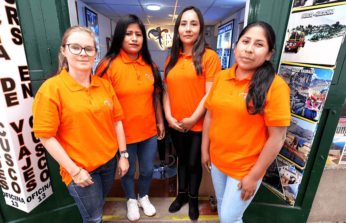 Equipo de Inti Paradise frente a su oficina en la calle de la Piedra de los 12 Ángulos en el centro histórico de Cusco