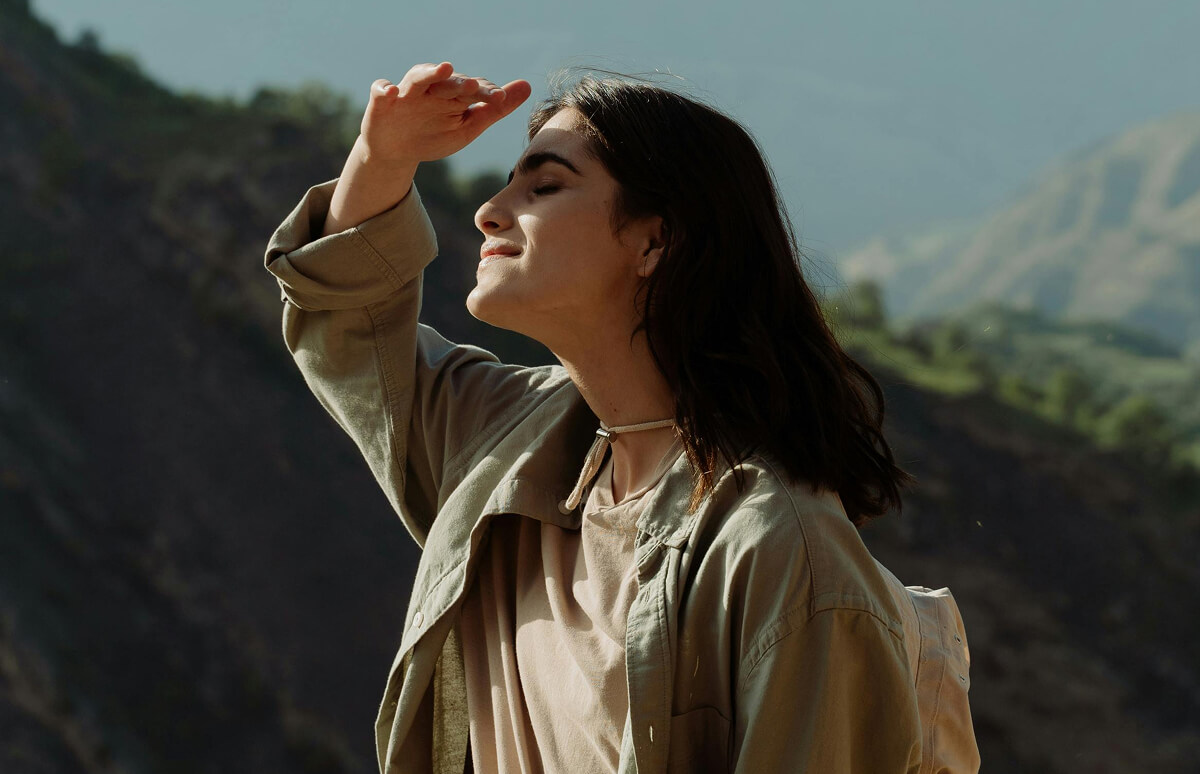 Viajera protegiéndose del sol y disfrutando con felicidad de sus experiencias únicas en Perú